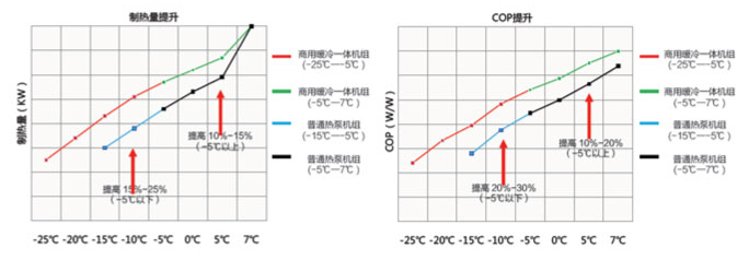 采用噴氣增焓壓縮機(jī),擴(kuò)寬運(yùn)行范圍及能力。低溫下與普通熱泵機(jī)組相比,能力提升10%~15%,能效提升15%~20%。