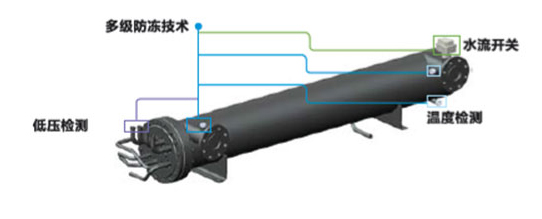 每個(gè)模塊都自帶水流開關(guān),單獨(dú)對(duì)各模塊進(jìn)行1級(jí)防凍保護(hù),此外還有2級(jí)溫度檢測(cè)、3級(jí)低壓檢測(cè)保護(hù),防止因水流不均勻、環(huán)溫過低等問題引起殼管凍壞。