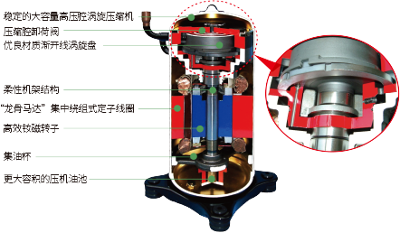 *注:側(cè)出風(fēng)機型采用直流變頻雙轉(zhuǎn)子壓縮機,頂出風(fēng)機型采用直流變頻渦旋壓縮機。右圖以224型頂出風(fēng)室外機產(chǎn)品的壓縮機為例。