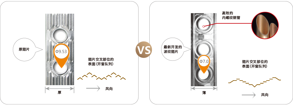 采用新型波紋設(shè)計,減少翅片斷面,換熱器耐鹽霧能力上升;有效減小風(fēng)阻,增大風(fēng)量,更有利于灰塵等 雜質(zhì)的通過,增加抗塵性,性能更穩(wěn)定。