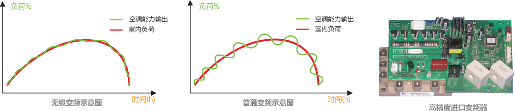 采用寬范圍高精度變頻器,變頻器輸出頻率范圍為0~300Hz,控制精度為0.01Hz。室外機(jī)直流變頻壓縮機(jī)的運(yùn)轉(zhuǎn)速度可以根據(jù)系統(tǒng)容量的變化進(jìn)行無(wú)級(jí)變頻調(diào)節(jié),精度更高,在增加用戶(hù)的舒適性的同時(shí),也提升了機(jī)組的節(jié)能性。