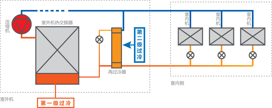 雙級(jí)過(guò)冷技術(shù),增大制冷能力和配管總長(zhǎng)