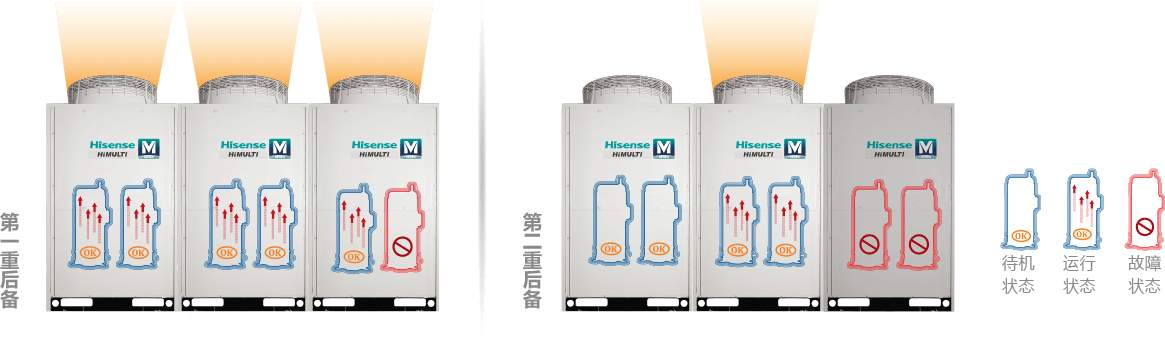 室外機(jī)風(fēng)機(jī)、壓縮機(jī)等部品具備應(yīng)急功能,機(jī)組在緊急情況下可實(shí)現(xiàn)應(yīng)急運(yùn)轉(zhuǎn)。第一重后備,即室外機(jī)的兩個(gè)壓縮機(jī)中有一個(gè)發(fā)生故障(12HP以上機(jī)型),另一個(gè)壓縮機(jī)也能進(jìn)行緊急運(yùn)轉(zhuǎn)。第二重后備,在超過(guò)16HP的系統(tǒng)中,如果一臺(tái)室外機(jī)發(fā)生故障,其余室外機(jī)也能進(jìn)行緊急運(yùn)轉(zhuǎn)。