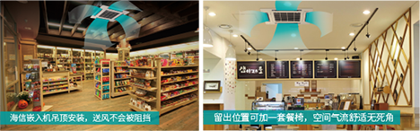 海信店鋪中央空調(diào)四方向嵌入機(jī),全新面板設(shè)計(jì),美觀時(shí)尚,可輕松融入各種裝修環(huán)境。在高端裝修的商業(yè)環(huán)境,如餐館、服裝店,可采用海信店鋪機(jī)嵌入吊頂安裝,不遮擋店內(nèi)光線,店鋪大氣明亮,與環(huán)境相得益彰。