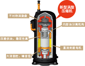 大容量髙壓腔渦旋壓縮機采用內(nèi)部油分離機構,通過內(nèi)部油霧分離器設計和內(nèi)部回油管設計,使壓縮機潤滑油大部分保存在壓縮機內(nèi),只有少量油被帶出壓縮機,有效防止因多余的冷凍油在制冷循環(huán)中造成的能力下降,效率進一步提高;采用防過壓縮技術,有效的防止了冷凝壓力過髙而造成的功耗增加問題,壓縮機運轉更節(jié)能,同時使得制冷系統(tǒng)更加穩(wěn)定可靠。