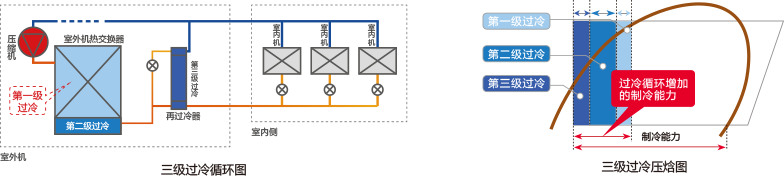 經(jīng)過前兩級過冷的冷媒,會通過高效的板式換熱器,利用膨脹閥的精準調(diào)節(jié),實現(xiàn)最優(yōu)的旁通過冷卻。 釆用三級過冷卻技術,可達成30°C過冷度,實現(xiàn)更好的性能、適應更長的安裝配管和高落差,滿足用戶節(jié)能和安裝需求。