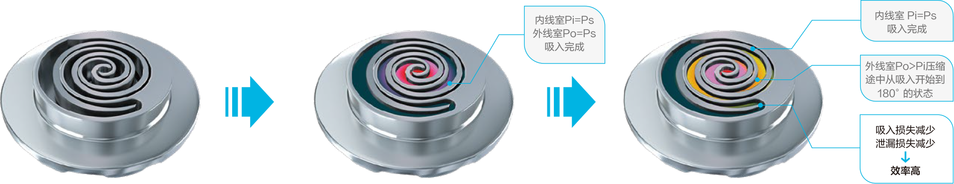 壓縮機(jī)采用不對稱渦旋盤結(jié)構(gòu),有效減少了冷媒氣體在吸入時(shí)和壓縮腔內(nèi)部的泄露損失,提高壓縮機(jī)運(yùn)行的效率和可靠性。與傳統(tǒng)的對稱壓縮機(jī)相比,可以將更多的冷媒吸入到同一容積中,因此增加了沖程容積。由于可以防止吸入到壓縮室中的低溫氣體被加熱,因此可以進(jìn)一步增加低溫氣體的進(jìn)入量和降低吸氣的無效過熱損失。