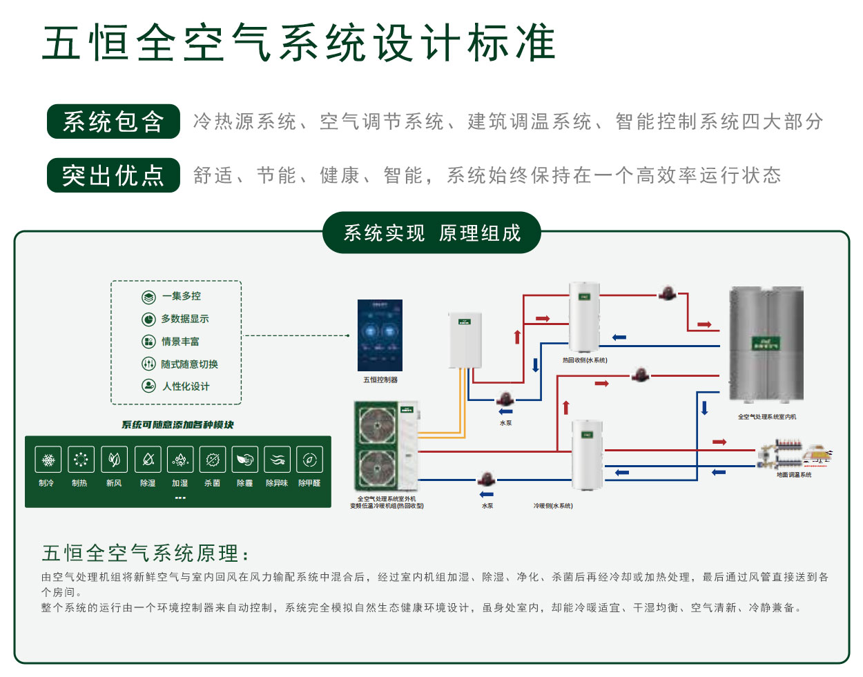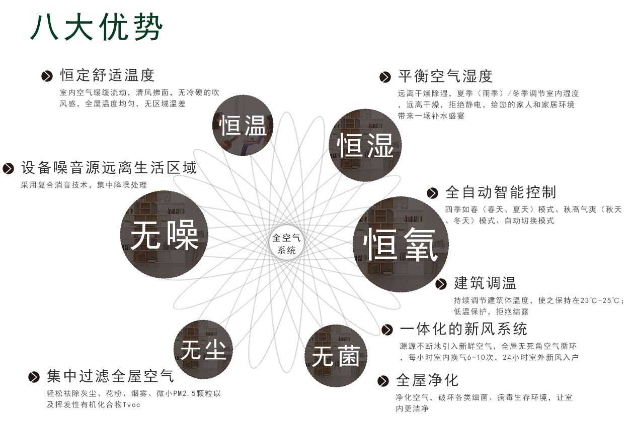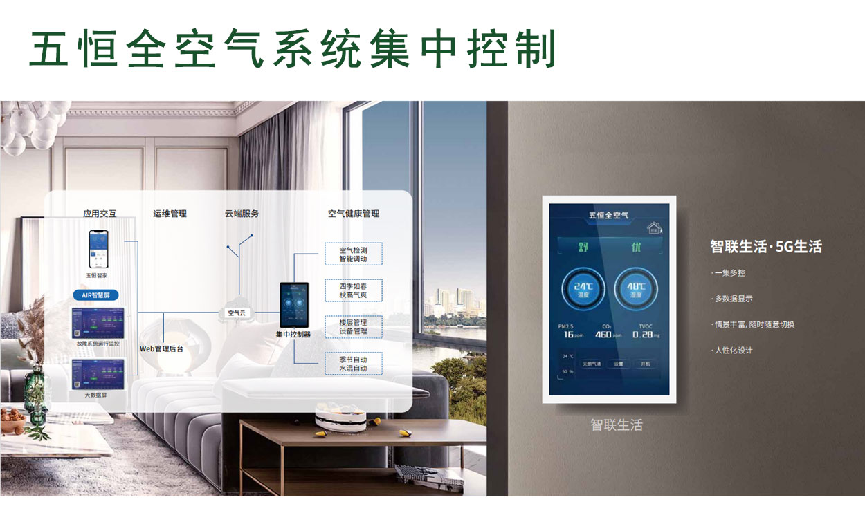全空氣系統(tǒng)使用一套系統(tǒng)迭代室內(nèi)空調(diào)、采暖、新風(fēng)、除濕、加濕、空氣凈化、空氣殺菌等多種設(shè)備組合;并以健康體感為標(biāo)準(zhǔn),電腦精準(zhǔn)調(diào)節(jié)全空氣控制邏輯