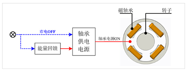 機組異常斷電時對電機進行制動發(fā)電,通過能量回饋位置軸承控制器的電機制動過程中穩(wěn)定懸浮,直至電機停止轉(zhuǎn)動。同時壓縮機備用軸承里的徑向軸承用來支持斷電后壓縮機的轉(zhuǎn)子,防止轉(zhuǎn)子與其他金屬表面接觸,保證軸承可靠性。