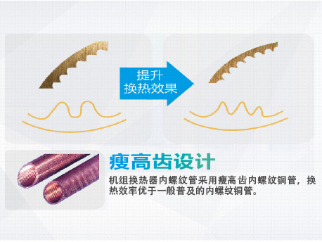 TURBO-B蒸發(fā)管,制冷劑在管路內(nèi)壁形成液膜,針對不同傳熱機理、流體介質(zhì)設(shè)計的特殊換熱表面,提高了殼管換熱效果,同時降低沿程流動壓力損失,減小機組能耗。
