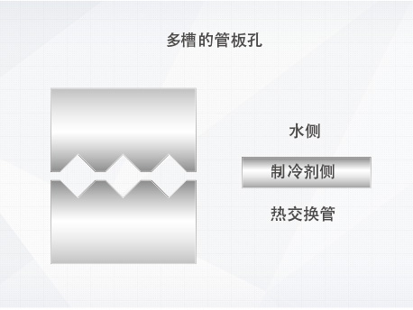 先進的3V槽管板,保證換熱管與管板的連接強度,換熱管與管板機械脹接密封,在脹接處設(shè)置三道密封凹槽,提高密封可靠性。
